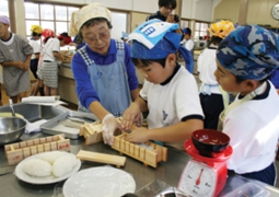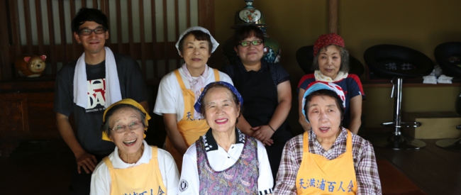 約30年前、天満浦に住むおかあさんたちのPTA活動から集まった仲間たちが、まちを元気にしようという想いで、自分たちができることを地道に楽しく続けてきました。 天満浦百人会は、21世紀の幕開けと共に「天満浦を元気にしよらい!」を合言葉に、仲間たちで結成。活動をはじめました。「百人会」という名前は、多くの皆さんの協力によってまちづくりをしたいという願いをこめてつけました。※100人もいません(笑) 結成当時は、災害時の炊き出しや、高齢者の見守り活動の配食サービスのための厨房の自前建設を大きな目標として、地区の特産品である甘夏みかんのマーマレードや竹ようかん、小さな焼き物のお地蔵さんなどを作っては市内の物産展などで販売を行ってきました。 そんな私たちが、大きな転機を迎えたのが「夢古道おわせ」のスカイフードレストランへの出店です。これを機に、任意団体から少しでも社会的な責任ある団体として成長していくために、NPO法人化を図り、2007年6月に、現在の「NPO法人天満浦百人会」として新しいスタートを切り、厨房「笑福工房」も自費で建てました。 そして天満浦のシンボルでもある大正14年築の「天満荘」を、中部電力から百人会で購入し、2010年にオープンしました。カフェの運営とともに文化講座や体験活動などを積極的に行っています。