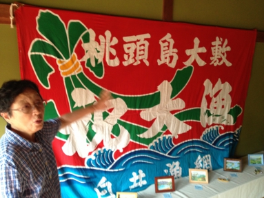 大漁旗は昭和40年頃迄は盛んに使用されていましたが、木造船からFRP船に変わるにつれ新しく造られる船の数も減り、大漁旗が贈られる機会も減りました。