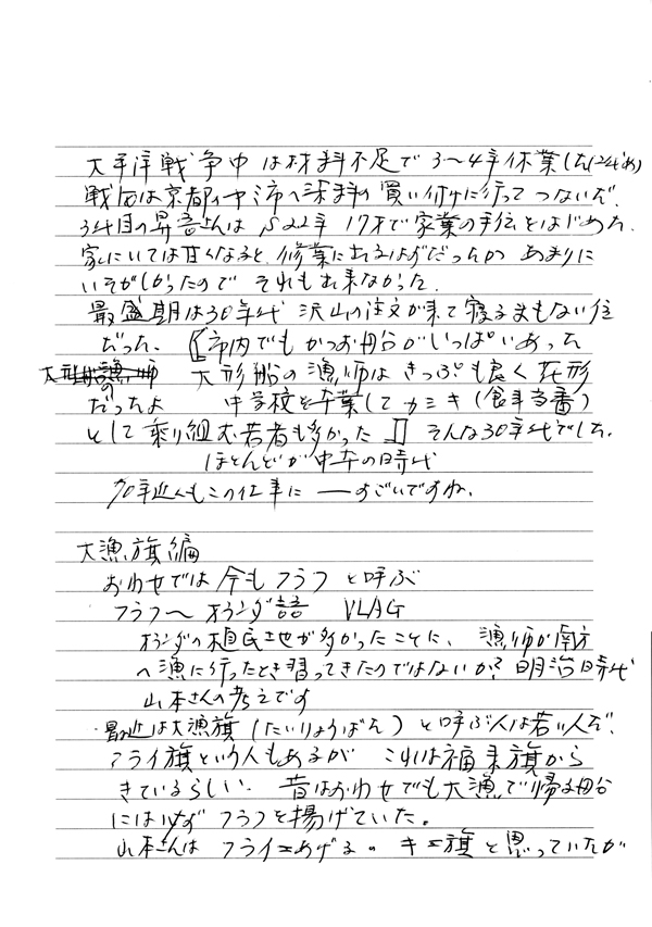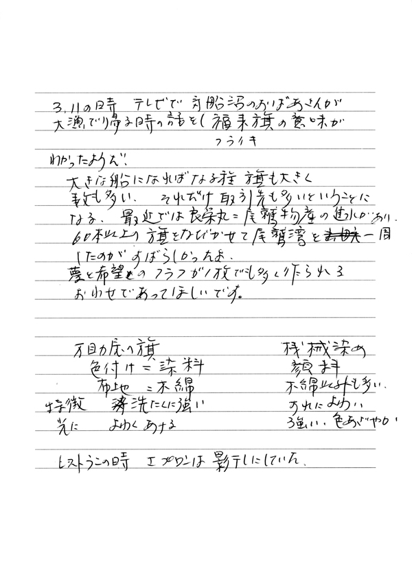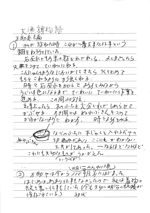 ここに天満浦百人会の松井さんが、紀州唯一の大漁旗染職人・万助屋の山本さんとの会話をもとに書き下ろした手記があります。何度かに分けて取材をするそうで、今後も手記は増える予定です。